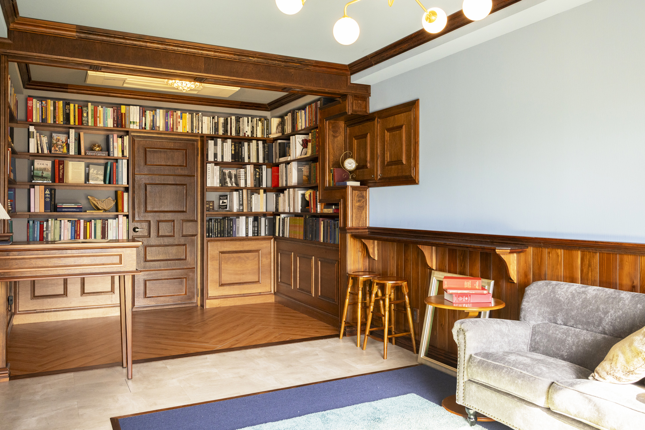 重厚感あふれる書庫とシックなカフェラウンジ。 書庫のディスプレイは西村廉樹 氏が監修し、美術的な完成度の高い世界観が広がります。 雑誌・広告・MVなど、「絵になる」シーンを演出。インタビューやアート撮影にも最適な象徴的空間。生配信や高画質撮影時は、有線LAN(NURO光10G)も利用可能です。